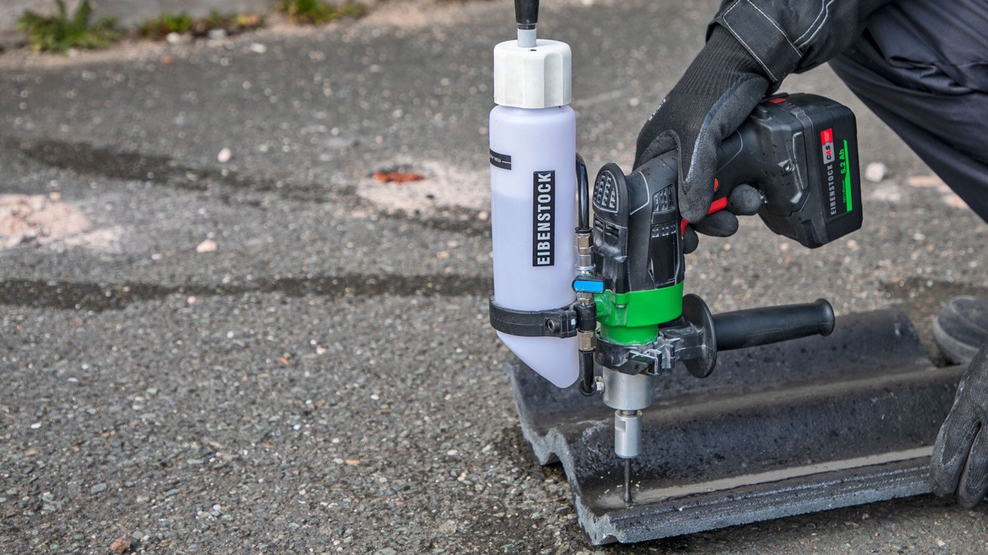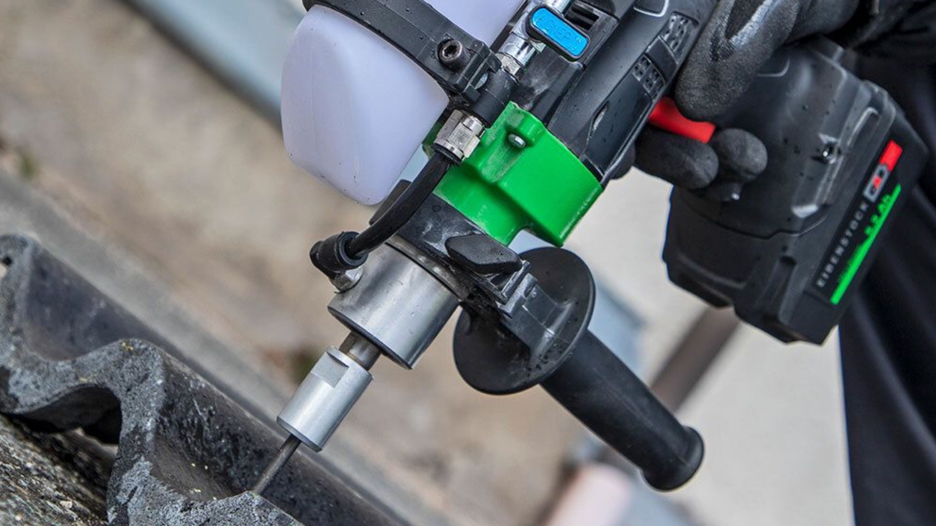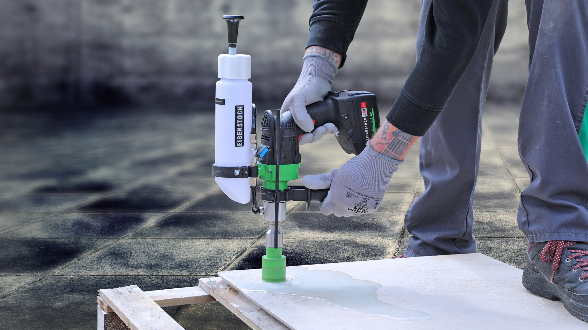 Аккумуляторный привод полностью автономен и удобен в работе, так как за дрелью не тянется сетевой кабель. Подача воды из бака в зону сверления может регулироваться. Эргономичные рукоятки и небольшой вес дрели облегчают работу оператора.