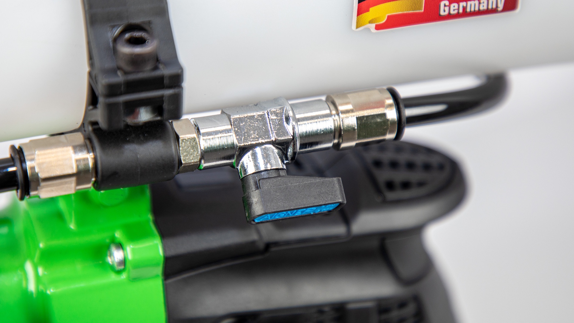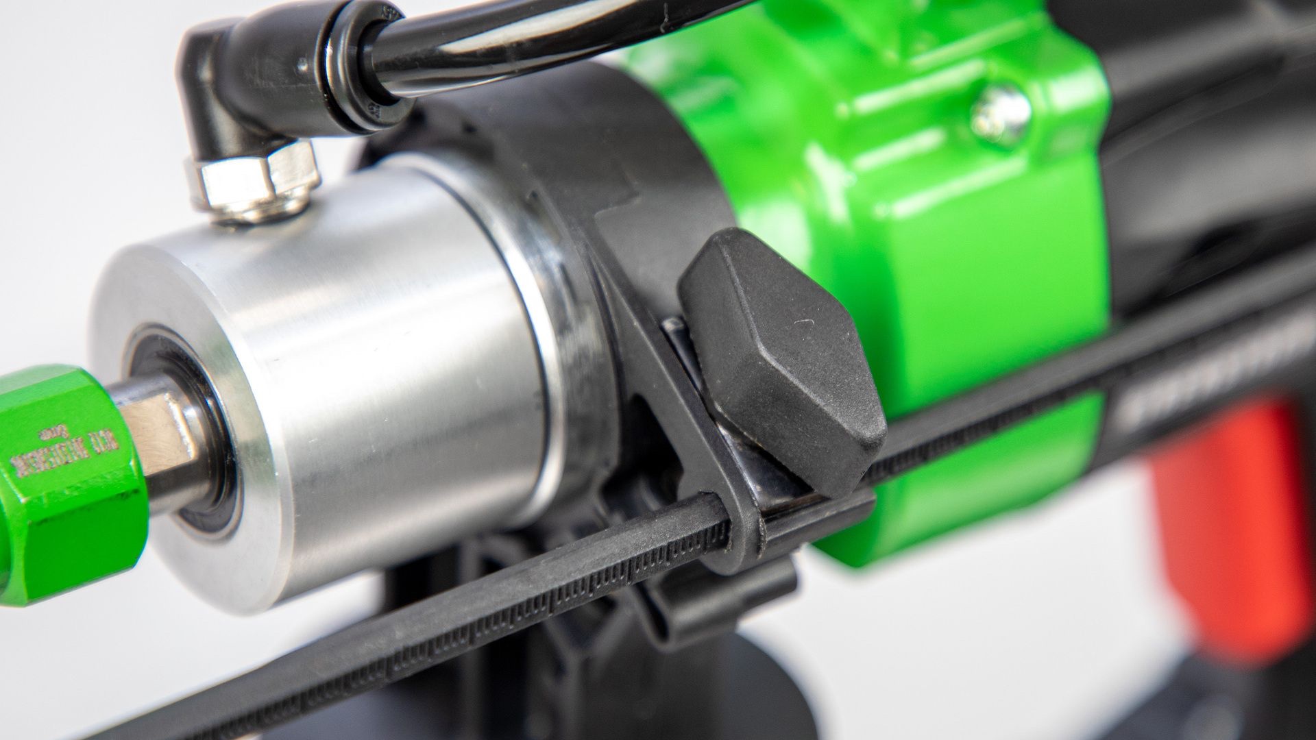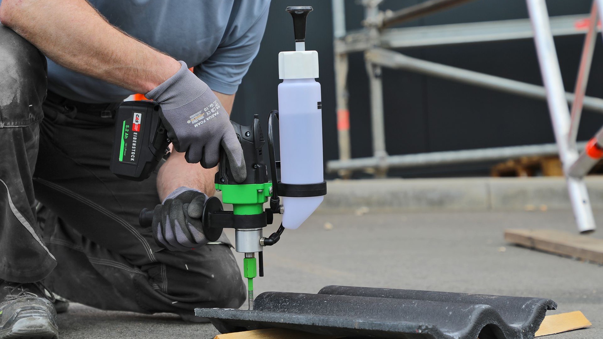 Аккумуляторный привод полностью автономен и удобен в работе, так как за дрелью не тянется сетевой кабель. Подача воды из бака в зону сверления может регулироваться. Эргономичные рукоятки и небольшой вес дрели облегчают работу оператора.