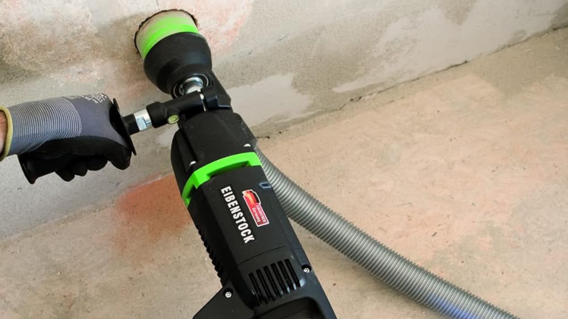 Алмазная дрель Eibenstock EHD 1500 имеет мощность 1,5 кВт и может сверлить отверстия в бетоне, кирпичной кладке, силикатном или клинкерном кирпиче, а также других материалах во время строительных или электромонтажных работ. Максимальный диаметр отверстий - 82 мм. Работа производится без подачи воды в зону сверления.