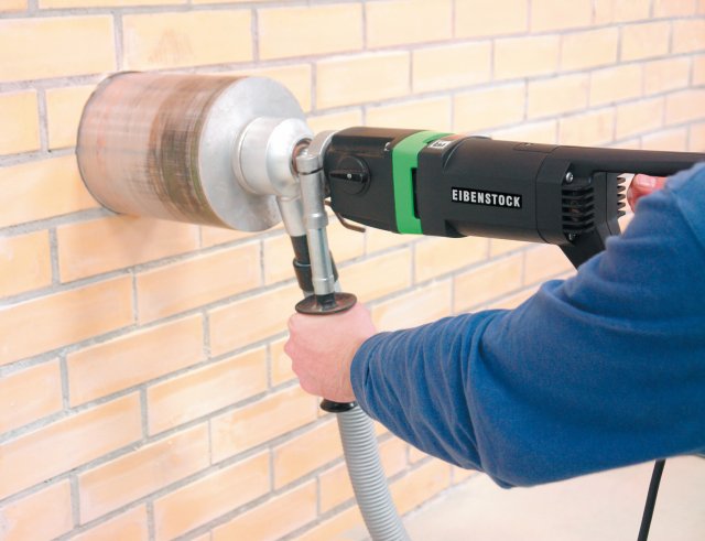 Алмазная дрель Eibenstock EHD 2000 S имеет мощность 1,7 кВт и может сверлить отверстия в кирпичной кладке, силикатном или клинкерном кирпиче, а также других материалах во время строительных или электромонтажных работ. Максимальный диаметр отверстий - 132 мм. Работа производится без подачи воды в зону сверления.