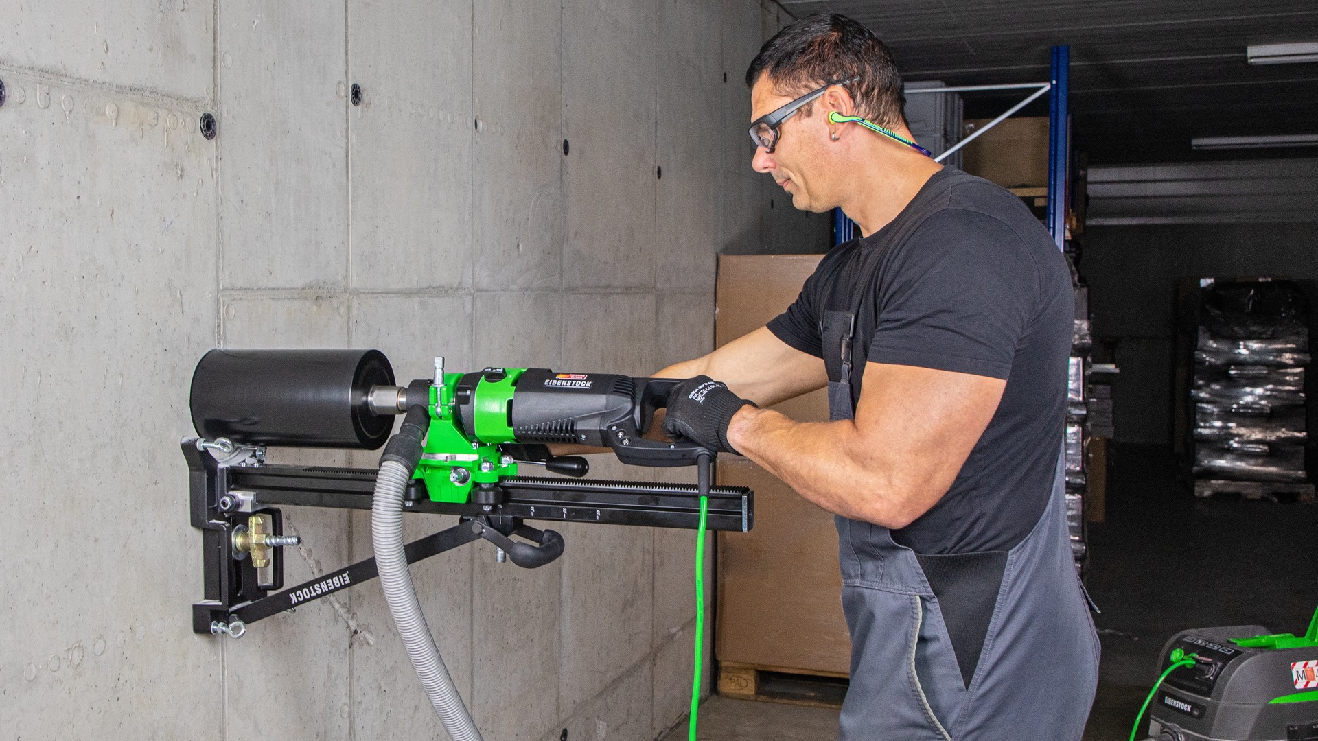 Алмазная дрель Eibenstock ESD 162 с микроударом имеет мощность 2,2 кВт и может сверлить без воды отверстия в бетоне, армированном бетоне, кирпичной кладке, силикатном или клинкерном кирпиче, а также других материалах во время строительных или электромонтажных работ. Максимальный диаметр отверстий по кирпичу - 202 мм, по бетону - 162 мм.