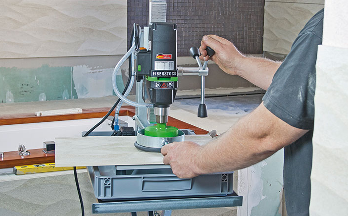 Станок для сверления плитки Eibenstock EFB 152 PX оснащен электродвигателем мощностью 1,15 кВт и может сверлить отверстия в натуральном камне, стекле, керамических пластинах и плитке. Максимальный диаметр отверстий - 120 мм. Работа производится с подачей воды в зону сверления. Оцинкованная опора станка не подвержена коррозии. Поддон системы водоотвода легко снимается и обеспечивает легкость очистки, а также устойчивость конструкции.