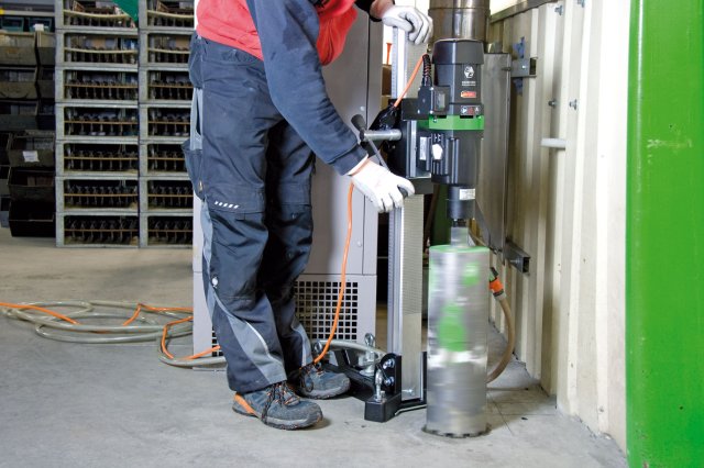 Установка алмазного бурения DBE 250 R представляет собой комплект из опорной стойки BST 250 и сверлильного мотора EBM 250/2 RP. Предназначена для сверления отверстий в бетоне, асфальте, кирпиче или камне с подачей воды в зону сверления. Максимальный диаметр сверления 250 мм.