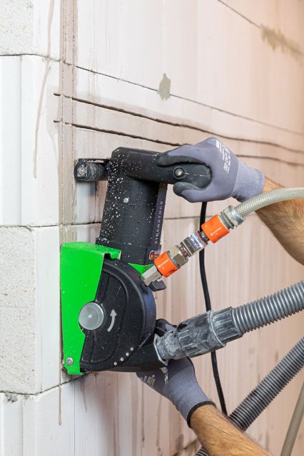 Штроборез Eibenstock EMF 150.1 P оснащен электродвигателем мощностью 2300 Вт с плавным пуском, температурным контролем и защитой от перегрузки. Используется для прорезания пазов и каналов в кирпичной кладке, силикатном кирпиче, бетоне или других материалах. Защитный кожух с патрубком для подключения пылесоса обеспечивают работу без пыли. Возможна работа с водяным охлаждением дисков, конструкцией предусмотрен штуцер для подключения шланга. Глубина фрезерования плавно регулируется до глубины 45 мм без дополнительных инструментов.