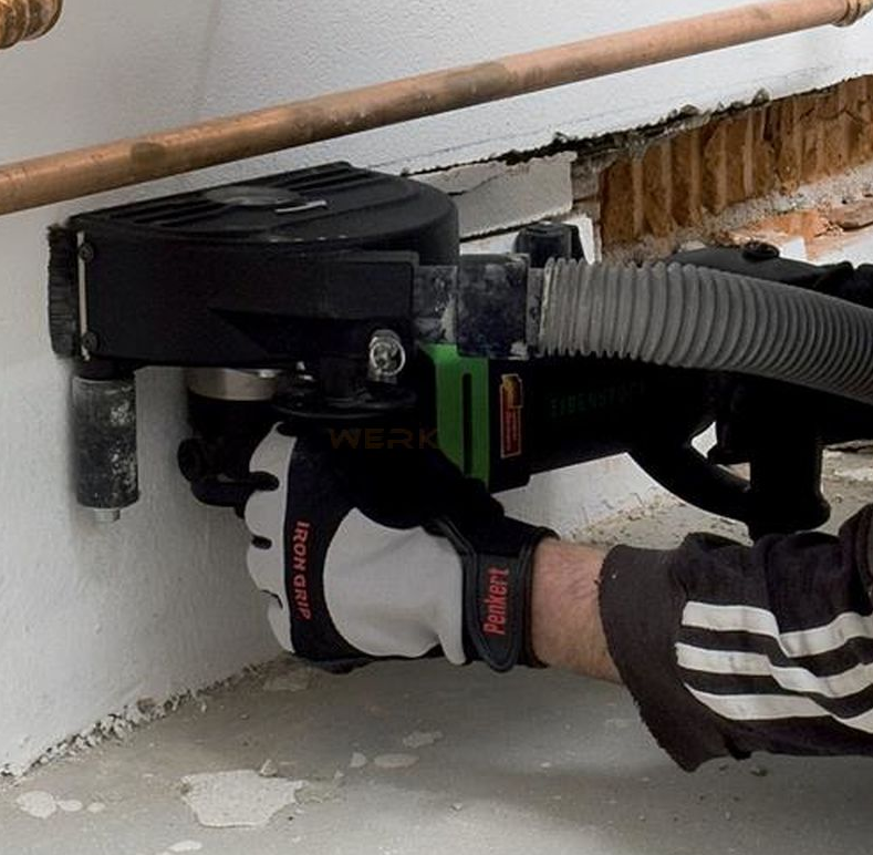 Штроборез Eibenstock EMF 180.2 оснащен электродвигателем мощностью 2300 Вт с плавным пуском, температурным контролем и защитой от перегрузки. Используется для прорезания пазов и каналов в бетоне, кирпичной кладке или силикатном кирпиче. Защитный кожух с патрубком для подключения пылесоса обеспечивают работу без пыли. Глубина фрезерования плавно регулируется до глубины 60 мм без дополнительных инструментов.